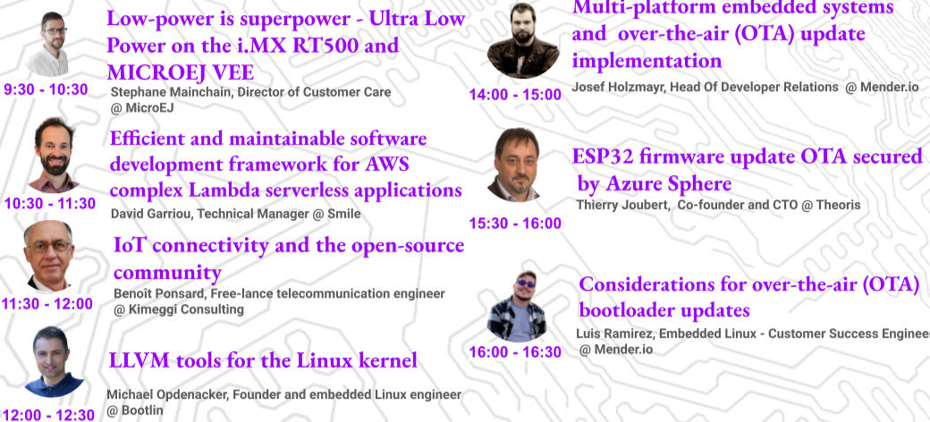 - How integration of Mender into your project can help with management of OTAsTrack 2 - 15:00-15:30 : PKCS#11 with OP-TEE (Thomas Perrot, Bootlin)